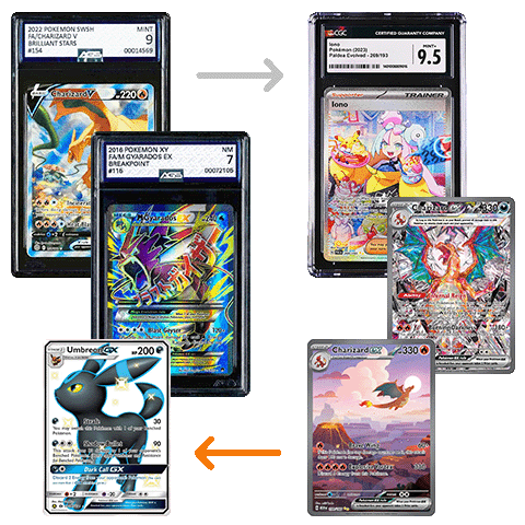 Charizard V 154, M Gyarados ex 115, Umbreon GX SV69